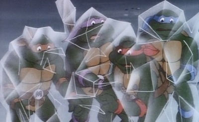 The Turtles head back outside, this time through the front door, expecting to see Superman, but instead are shocked to see a menacing figure standing in the yard, dressed in an olive green cape, with a large television set embedded in his chest and a satellite over his head like a helmet.