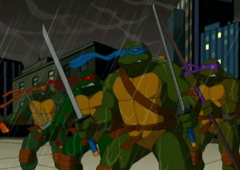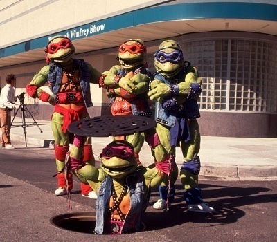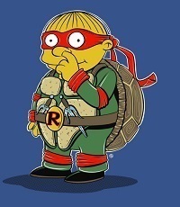 After Frasier (Kelsey Grammer) makes a joke about the Ninja Turtles, Cliff (John Ratzenberger) mentions how not too many people know they started out as a comic book. Kermit the Frog (Frank Welker), Fozzie Bear (Greg Berg), Animal (Dave Coulier), Rowlf (Katie Leigh) and Bean Bunny (Dave Coulier) do a musical number dressed as the Ninja Turtles. While helping Rose (Betty White) deal with a co-worker, Sophie (Estelle Getty) brings up the fact that she once owned a tranquilizer dart gun, but it had gotten confiscated after an incident with some Trick or Treaters. "In my defense it was dark out, and I was unaware of this Ninja Turtles craze." Joey (Dave Coulier) wears Ninja Turtle pajamas at a slumber party he attends with Stephanie (Jodie Sweetin). D.J. (Candace Cameron) babysits a young boy who pretends to be a Ninja Turtle and calls her Krang. In a similar incident Rebecca (Lori Louglin) invites her little nephew over who annoys Michelle (Mary-Kate and Ashley Olsen) by pretending to be Raphael and calling her Shredder. When Rebecca learns she's pregnant, she decides to surprise Jesse (John Stamos) with the news via a game of charades. During the game, Michelle guesses Teenage Mutant Ninja Turtles. While Joey is under investigation for purchasing a stolen vehicle, the Tanner family shows the detective all of his toys and cartoon memorabilia, including a pair of Ninja Turtle slippers. Danny (Bob Saget) goes on a date at an 80's nostalgia restaurant and in the background there's a Ninja Turtle poster. Kelly (Christina Applegate) teases Bud (David Faustino) for having a Donatello pillow. The Bundys check out a coffin shop and see a Teenage Mutant Ninja Turtle number, which the salesman mentions Michael Jackson picked out for Macaulay Culkin. While Homer (Dan Castellaneta) is being lectured by a children's birthday party conglomerate, they cut to a shot of college grads dressed in Ninja Turtle costumes popping out of a cake. Similar to a Futurama episode title (see entry below), this show had an episode titled "Teenage Mutant Milk-Caused Hurdles"! As Lisa Simpson (Yeardley Smith) stays home sick from school, she reads up on the history of the Italian renaissance, most notably Leonatdo Da Vinci. The textbook has a humorous drawing of a Ninja Turtle named Leonardo Da Ninji. Upon meeting famed Italian renaissance artist Leonardo Da Vinci, Bill S. Preston Esquire (Alex Winter) and Ted "Theodore" Logan (Keanu Reeves) assume he's Leonardo of the Ninja Turtles and ask where some of the other Turtles are. ![]() NOTE: In the 1989 live action film this cartoon was based off of, Bill and Ted gathered several historic figures to help them pass their history report, including Napoleon Bonaparte and Genghis Khan, both of whom happen to be namesakes of the two Punk Frogs from the 1987 TMNT cartoon series that got their own action figures in the original Playmates toyline! The Ninja Turtles make some amusing appearances throughout the course of the series, and at one point are parodied as Immature Radioactive Samurai Slugs. Wheeler has pizza delivered, which upsets his fellow Planeteers who are concerned with helping sea turtles that are being exposed to toxic waste. Wheeler comments how turtles somehow gave him the subliminal craving. Later in the same episode Captain Planet makes a couple other funny references to the TMNT! When Jules Brown (Josh Keaton) invents a money tree, he claims "I've found myself more popular than those juvenile martial artist mutations on the half-shell.". The Ninja Turtles are parodied as cavemen. Al (Richard Karn) mentions that his pet turtle Scooter likes to watch the Ninja Turtles. While attempting to infiltrate Warner Bros. Studios, Plucky (Joe Alaskey) and Hampton (Don Messick) go into the sewers where the Ninja Turtles are seen running across the screen. Plucky immediately says to the audience "Who saw that one coming?" Squat and Baboo create a turtle monster named Shellshock and send him to fight the Power Rangers. At one point Rita enlarges Shellshock, who says "Lets show those teenage mutants what a full grown turtle can do!" In the opening to an episode about the artist Michelangelo, the Ninja Turtles make a brief cameo. Steve (Corbin Allred) says to a forlorn Marty (Mike Damus) "I haven't seen you this upset since you found out the Ninja Turtles aren't real." Bobby (Pamela Adlon) looks at an old picture of himself dressed as Raphael for Halloween and comments on how dorky he looked back then. When Stan (Trey Parker), Kyle (Matt Stone) and a couple school friends travel to Imaginationland, several famous fictional characters can be seen, including a generic Ninja Turtle with a black bandana. While none of the characters in the show itself have ever made any direct references to the Ninja Turtles, the ongoing plot about mutants living in exile within the subterranean ruins of the original New York City and a river of toxic waste capable of mutating humans could be perceived as an homage. ![]() Mayor West (Adam West) and Meg (Mila Kunis) watch an episode of Ninja Turtles in a hotel room. Only the theme song is heard. Around the time actor Seth Green got the role of Leonardo on the 2012 CGI series (replacing Jason Biggs) his Family Guy character Chris Griffen paid homage to that connection in a cutaway where Chris is in the hospital. The doctor tells him to stop lifting manhole covers, and Chris rebutts by explaining that he's friends with the Ninja Turtles, when a sewer worker shows up to bring him flowers, who Chris assumes is Donatello (Personally, I think it's ashame they couldn't have actually used Rob Paulsen for this scene, though he doesn't usually get involved with adult oriented animated programming) Francis (Christopher Masterson) discovers Grandma Ida (Cloris Leachman) had been hoarding years worth of Christmas presents from him and his family. Among them is a Pizza Throwing Donatello action figure. The Ninja Turtles are parodied as Adolescent Genetically Altere