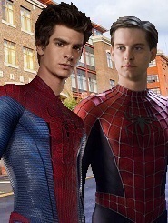 Jeff and Patrick walk up to the two web-headed super heroes who promptly remove their masks revealing themselves to be the Sam Raimi film iteration played by Tobey Maguire and The Amazing Spider-Man played by Andrew Garfield.