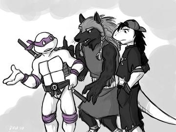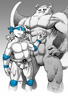 Kid and the Turtles couldn't believe their eyes as they saw what looked like a six foot tall figure with the hind legs of a horse, the body of a walrus, the arms of a lion and the head of a golden retriever.