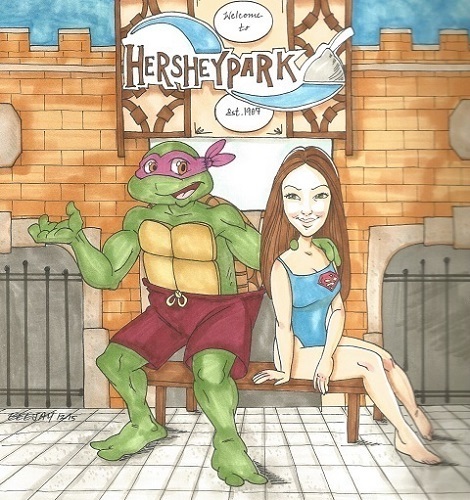 "Really? I'm more in the mood for a hoagie." the Turtle joked as they left the water park section of Hershey Park. Ten minutes later they neared the main exit, when Donatello looked down at the holographic watch. "Uh oh, we'd better hurry. The battery life on these things doesn't last more than about 5 hours."